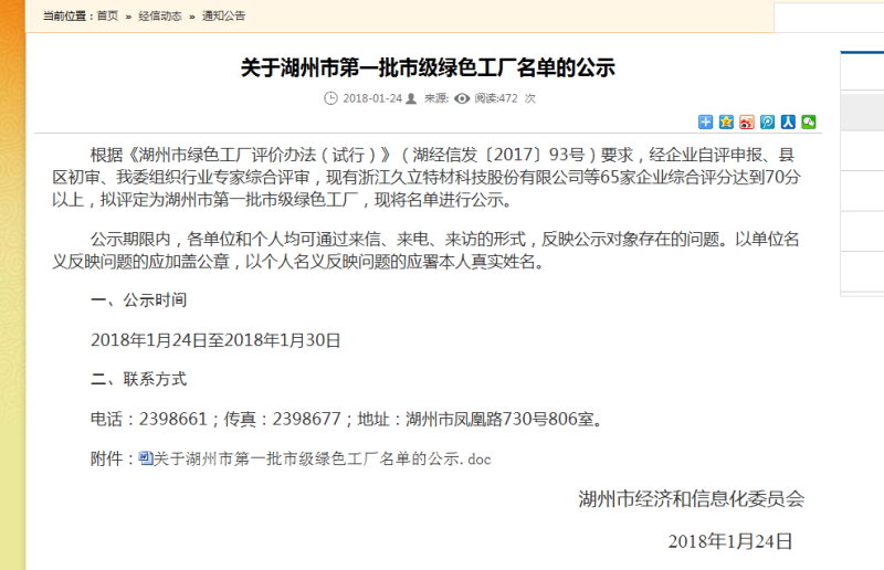 新開元入選為湖州市第一批市級綠色工廠