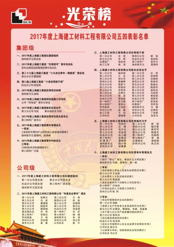 材料公司“五四”表彰大會(huì)暨青年突擊隊(duì)授旗儀式于5月11日下午在上海召開,會(huì)上表彰了一批在2017年成績(jī)突出的先進(jìn)集體及個(gè)人。新開元共獲得了三項(xiàng)集團(tuán)榮譽(yù)和六項(xiàng)材料公司榮譽(yù)(集團(tuán)紅旗團(tuán)組織、集團(tuán)優(yōu)秀項(xiàng)目經(jīng)理、集團(tuán)青年管理論文一等獎(jiǎng)、材料公司紅旗團(tuán)組織、材料公司年度杰出青年提名、材料公司優(yōu)秀團(tuán)干部、材料公司新長(zhǎng)征突擊手、材料公司優(yōu)秀操作巧手、材料公司優(yōu)秀青年管理論文)。
