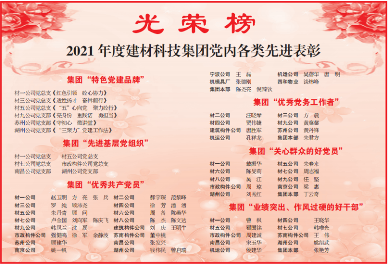 7月4日,上海建工建材科技集團(tuán)召開黨內(nèi)先進(jìn)表彰會(huì)暨黨建品牌發(fā)布會(huì)。湖州公司榮獲2021年度上海建工建材科技集團(tuán)“先進(jìn)基層黨組織”,姚紹武同志榮獲上海建工建材科技集團(tuán)“業(yè)績(jī)突出、作風(fēng)過硬的好干部”,錢偉民同志、曾啟瑞同志榮獲上海建工建材科技集團(tuán)“優(yōu)秀共產(chǎn)黨員”,劉秀紅同志榮獲上海建工建材科技集團(tuán)“關(guān)心群眾的好黨員”。